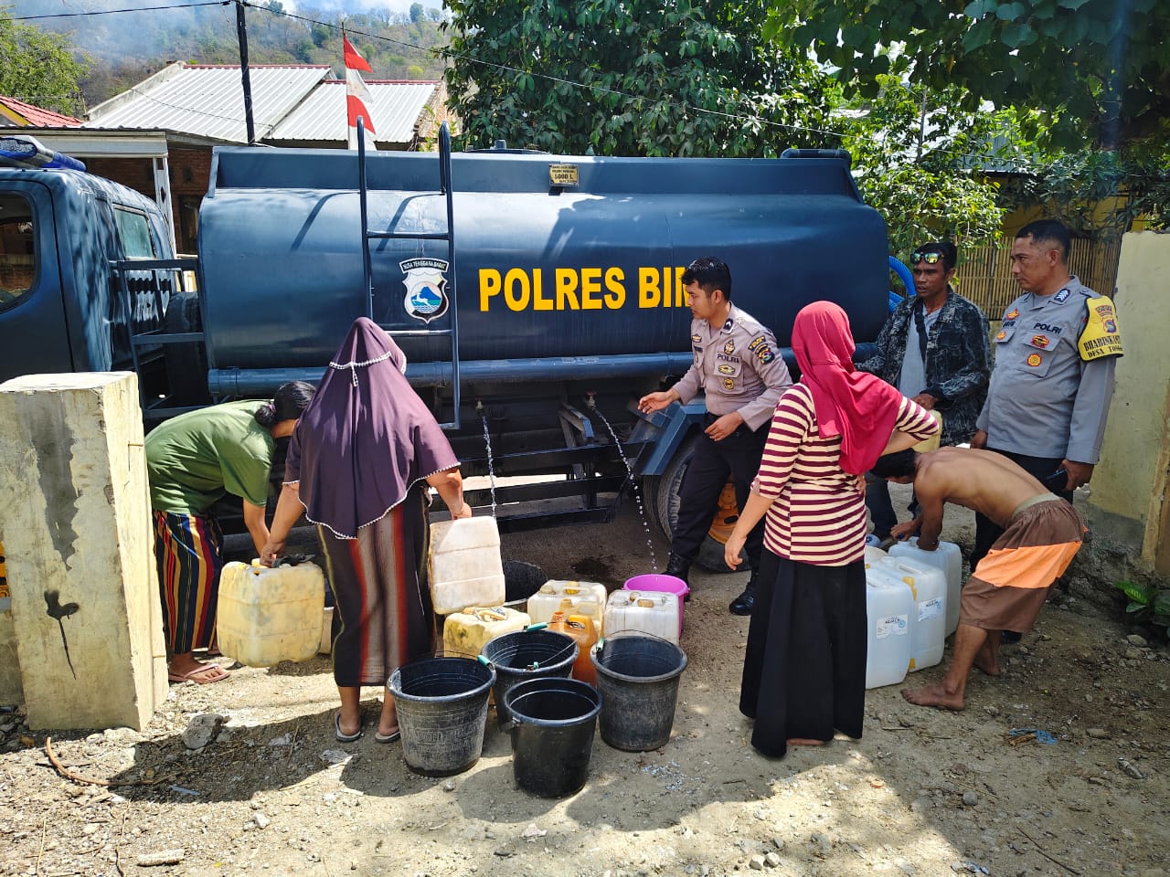 Salah satunya yakni yang dialami warga di Tonggorisa Kecamatan Palibelo Kabupaten Bima , menyalurkan bantuan air bersih menggunakan rantis/tangki bermuatan Air bersih untuk warga yang kesulitan mendapatkan air bersih.