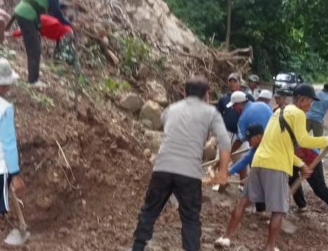 Bima, NTB (07/2) – Bersama warga Binaannya Bhabinkamtibmas Polsek Madapangga Polres Bima Polda NTB Bripka Muhlis gotong royong membersihkan material longsor yang menutup akses jalan Desa Kamis (06/06/2025), pagi.
