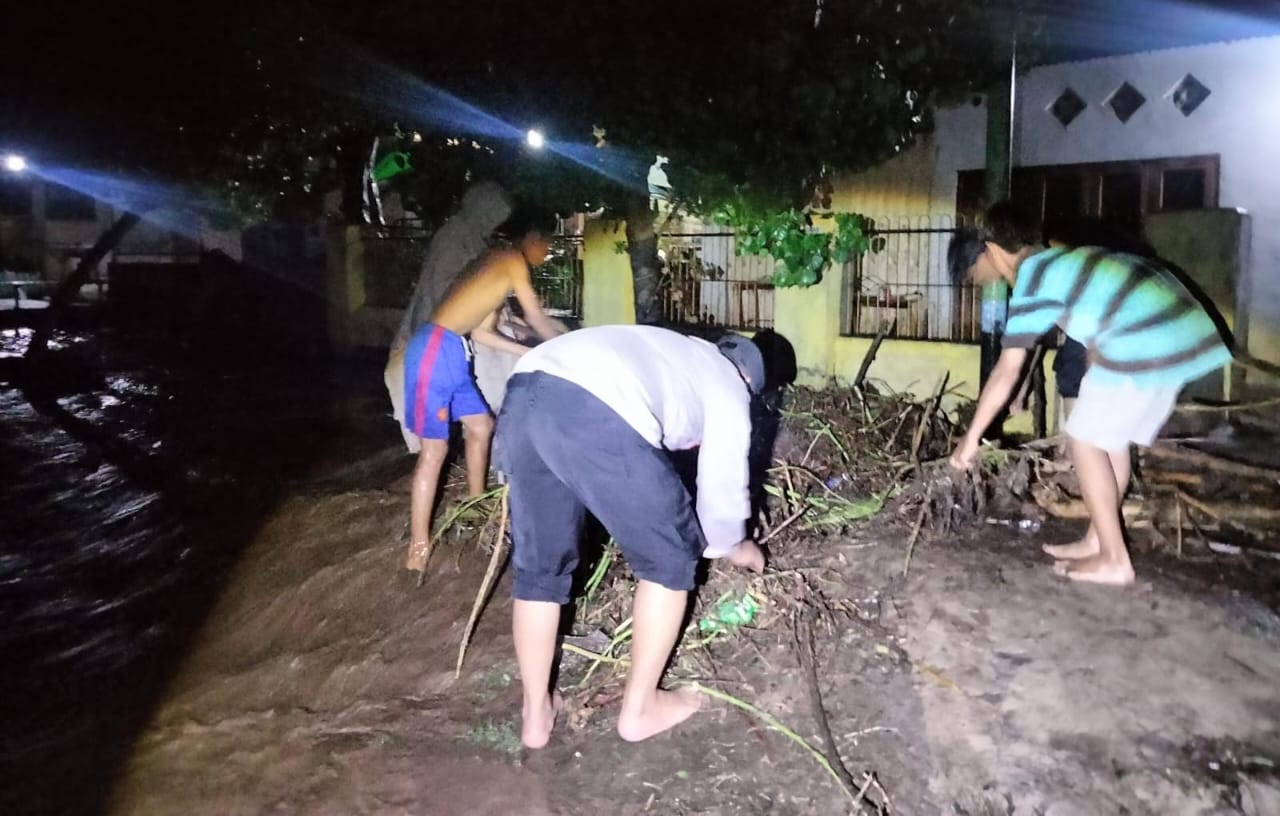 Tanggap dengan kondisi itu Bhabinkamtibmas Polsek Sanggar Polres Bima Polda NTB Aipda Ahmad Rifai menuju lokasi dan membantu warga yang terdampak luapan air.