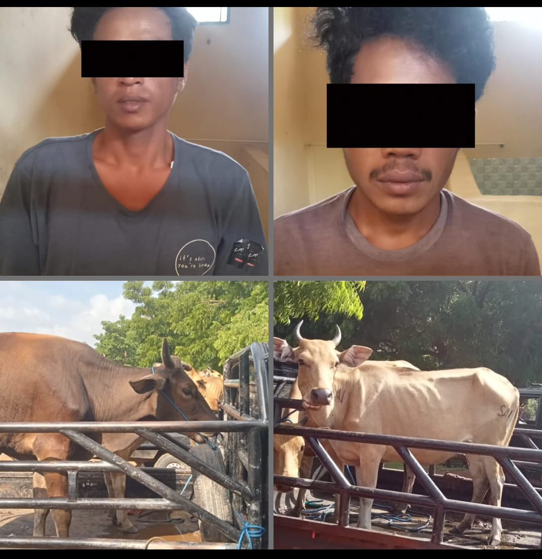 “Benar kami mengamankan 2 terduga pelaku atau Komplotan pencurian hewan ternak/ sapi dengan barang bukti 2 unit mobil pickup dan empat ekor sapi sedang 4 rekan terduga masih diburu”. Kata Kapolres mengutip Adib.