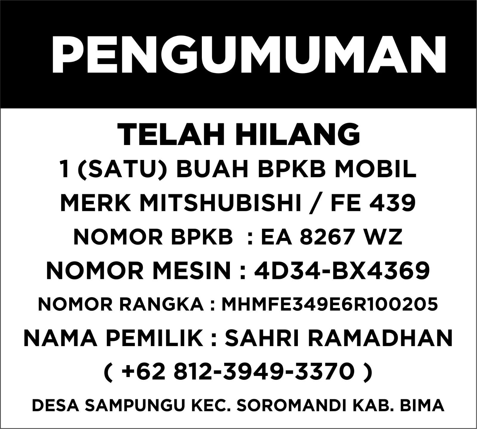 Informasi Kehilangan BPKB Mobil AdminAgustus 25, 2024Agustus 25, 2024 Pos terkaitBhabinkamtibmas Jatibaru Timur Sosialisasi Layanan 110 dan Imbau Warga Tidak Gunakan Knalpot BrongBhabinkamtibmas Nungga Pantau Pendistribusian Makan Bergizi Gratis di Rasanae TimurBantu Anak Sekolah Menyebrang Jalan, Polsek Lambu Laksanakan Kegiatan Rawan PagiPolsek Rasanae Barat Gelar Patroli Blue Light untuk Jaga Kamtibmas di Wilayah Kota BimaJelang Pergantian Tahun, Polsek Sape Sita Ratusan Botol Minuman BeralkoholSat Samapta Polres Bima Kota Gelar Latihan Menembak Gas Air Mata (Flashball) Bersama Sat Brimob Kompi C Polda NTB