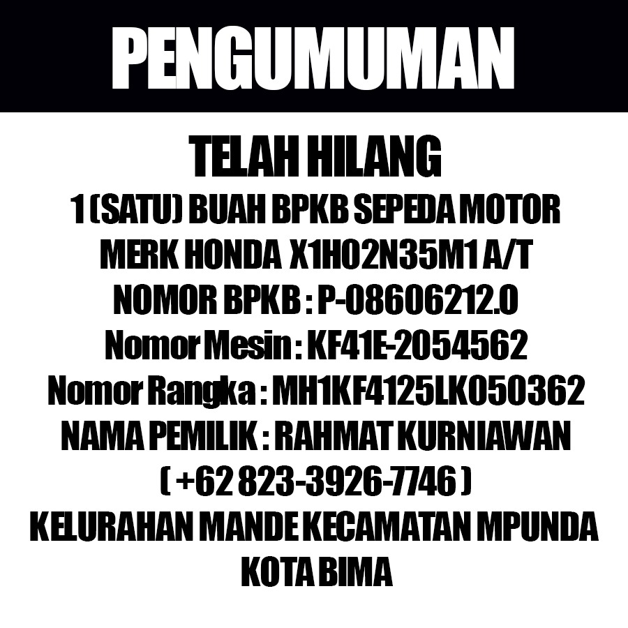 Informasi Kehilangan BPKB Mobil AdminSeptember 4, 2024September 4, 2024 Pos terkaitBhabinkamtibmas Jatibaru Timur Sosialisasi Layanan 110 dan Imbau Warga Tidak Gunakan Knalpot BrongBhabinkamtibmas Nungga Pantau Pendistribusian Makan Bergizi Gratis di Rasanae TimurBantu Anak Sekolah Menyebrang Jalan, Polsek Lambu Laksanakan Kegiatan Rawan PagiPolsek Rasanae Barat Gelar Patroli Blue Light untuk Jaga Kamtibmas di Wilayah Kota BimaJelang Pergantian Tahun, Polsek Sape Sita Ratusan Botol Minuman BeralkoholSat Samapta Polres Bima Kota Gelar Latihan Menembak Gas Air Mata (Flashball) Bersama Sat Brimob Kompi C Polda NTB