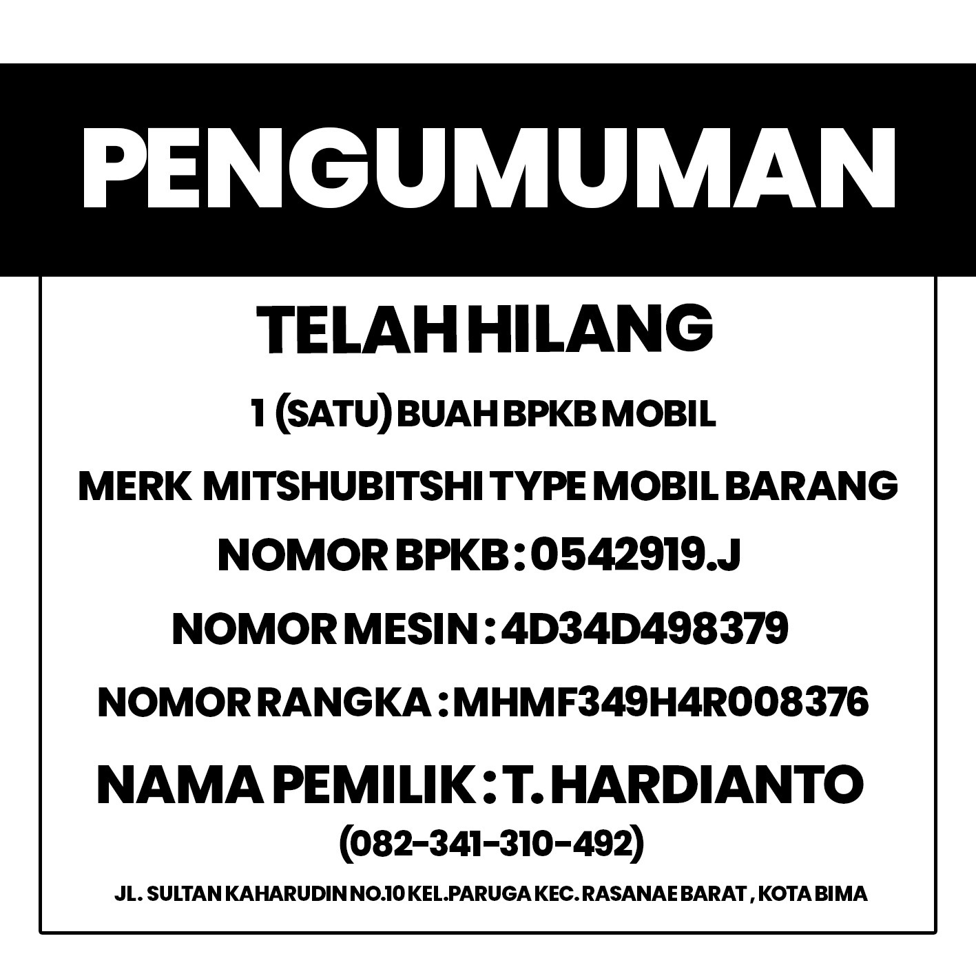 Informasi Kehilangan BPKB Mobil AdminFebruari 16, 2024Februari 16, 2024 Pos terkaitBhabinkamtibmas Jatibaru Timur Sosialisasi Layanan 110 dan Imbau Warga Tidak Gunakan Knalpot BrongBhabinkamtibmas Nungga Pantau Pendistribusian Makan Bergizi Gratis di Rasanae TimurBantu Anak Sekolah Menyebrang Jalan, Polsek Lambu Laksanakan Kegiatan Rawan PagiPolsek Rasanae Barat Gelar Patroli Blue Light untuk Jaga Kamtibmas di Wilayah Kota BimaJelang Pergantian Tahun, Polsek Sape Sita Ratusan Botol Minuman BeralkoholSat Samapta Polres Bima Kota Gelar Latihan Menembak Gas Air Mata (Flashball) Bersama Sat Brimob Kompi C Polda NTB