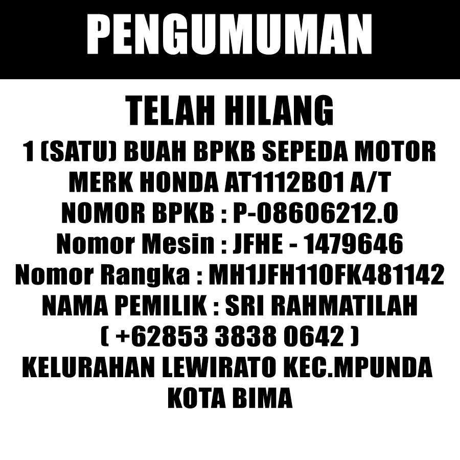 Informasi Kehilangan BPKB Sepeda Motor AdminSeptember 25, 2024September 25, 2024 Pos terkaitBhabinkamtibmas Jatibaru Timur Sosialisasi Layanan 110 dan Imbau Warga Tidak Gunakan Knalpot BrongBhabinkamtibmas Nungga Pantau Pendistribusian Makan Bergizi Gratis di Rasanae TimurBantu Anak Sekolah Menyebrang Jalan, Polsek Lambu Laksanakan Kegiatan Rawan PagiPolsek Rasanae Barat Gelar Patroli Blue Light untuk Jaga Kamtibmas di Wilayah Kota BimaJelang Pergantian Tahun, Polsek Sape Sita Ratusan Botol Minuman BeralkoholSat Samapta Polres Bima Kota Gelar Latihan Menembak Gas Air Mata (Flashball) Bersama Sat Brimob Kompi C Polda NTB