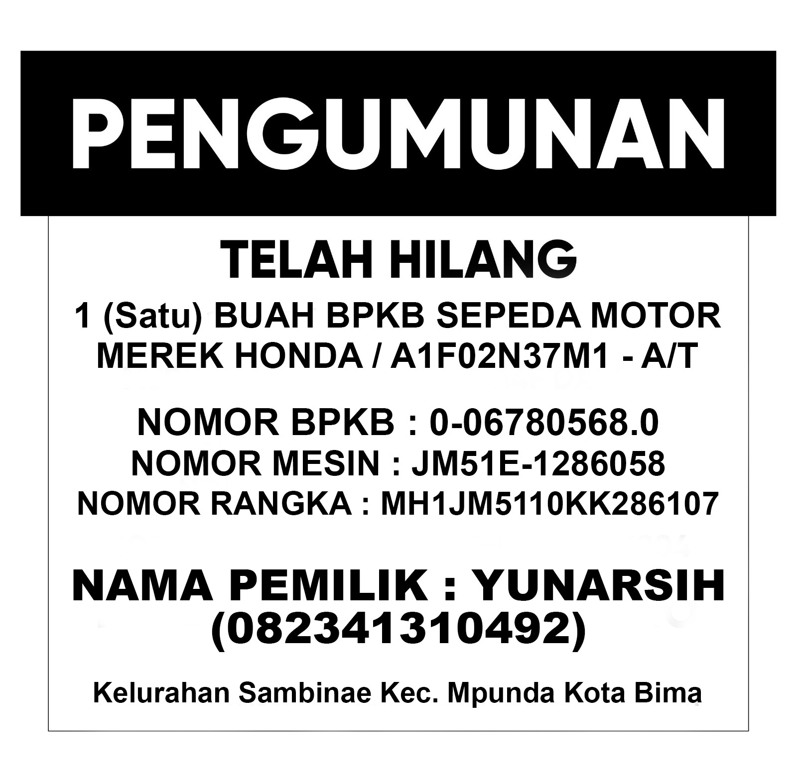 Informasi Kehilangan BPKB Sepeda Motor AdminJuli 25, 2024Juli 25, 2024 Pos terkaitBhabinkamtibmas Jatibaru Timur Sosialisasi Layanan 110 dan Imbau Warga Tidak Gunakan Knalpot BrongBhabinkamtibmas Nungga Pantau Pendistribusian Makan Bergizi Gratis di Rasanae TimurBantu Anak Sekolah Menyebrang Jalan, Polsek Lambu Laksanakan Kegiatan Rawan PagiPolsek Rasanae Barat Gelar Patroli Blue Light untuk Jaga Kamtibmas di Wilayah Kota BimaJelang Pergantian Tahun, Polsek Sape Sita Ratusan Botol Minuman BeralkoholSat Samapta Polres Bima Kota Gelar Latihan Menembak Gas Air Mata (Flashball) Bersama Sat Brimob Kompi C Polda NTB