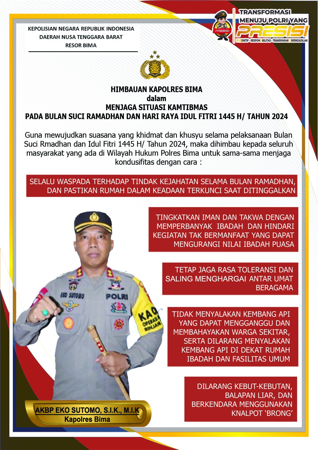 Bima, NTB (13/3) – Dalam rangka menjaga situasi Kamtibmas yang kondusif pada Bulan Suci Ramadhan dan Hari Raya Idul Fitri 1445 H/ 2024 M, Kapolres Bima Polda NTB, AKBP Eko Sutomo SIK.,MIK.,mengeluarkan sejumlah himbauan.