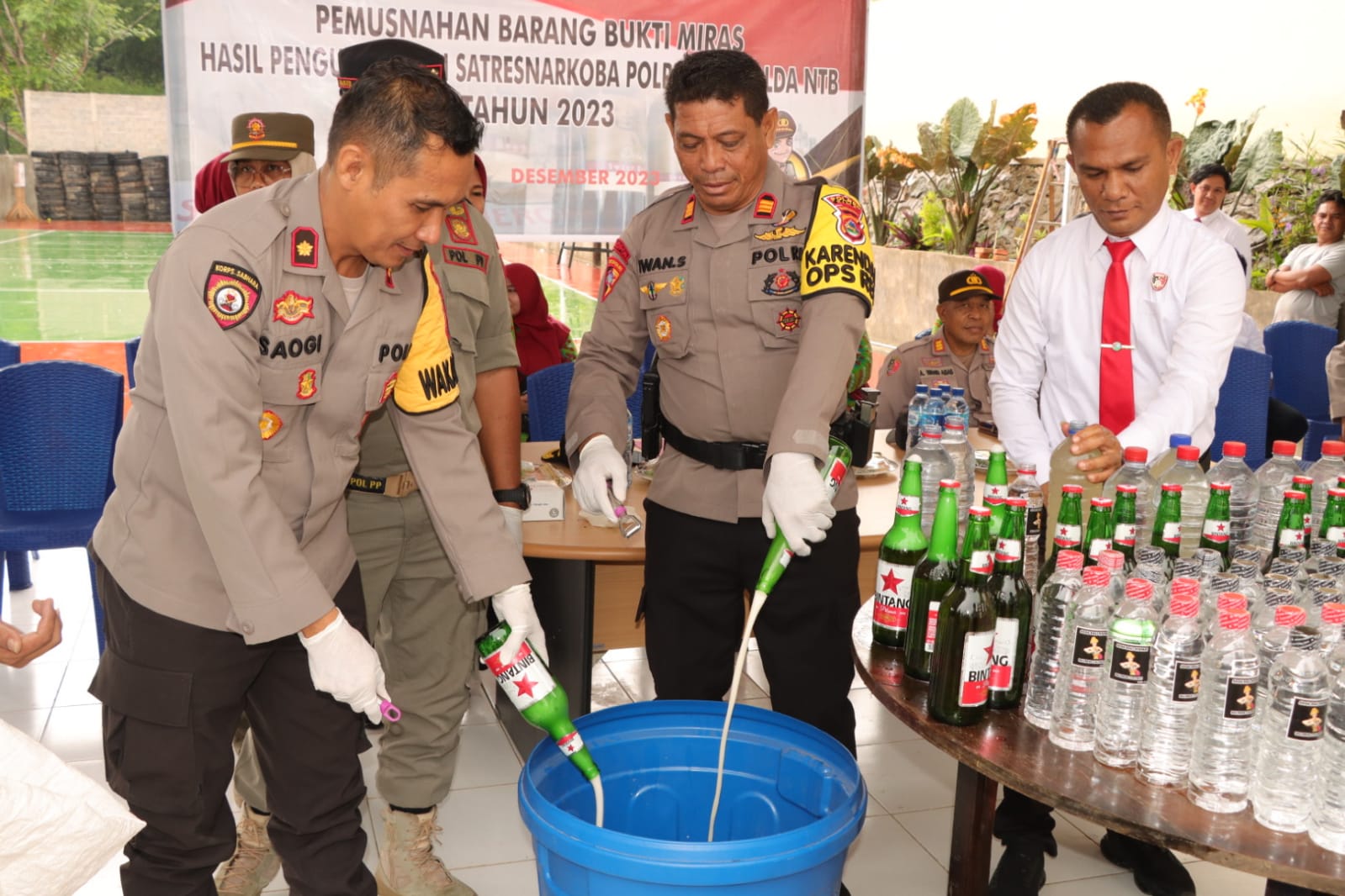 Bima, NTB (22/12) – Satuan Reserse Narkoba Polres Bima Polda NTB melaksanakan pemusnahan barang bukti ribuan Botol minuman keras/ miras Berbagai jenis menjelang Natal dan tahun Baru 2024 yang ikut di saksikan oleh berbagai elemen.