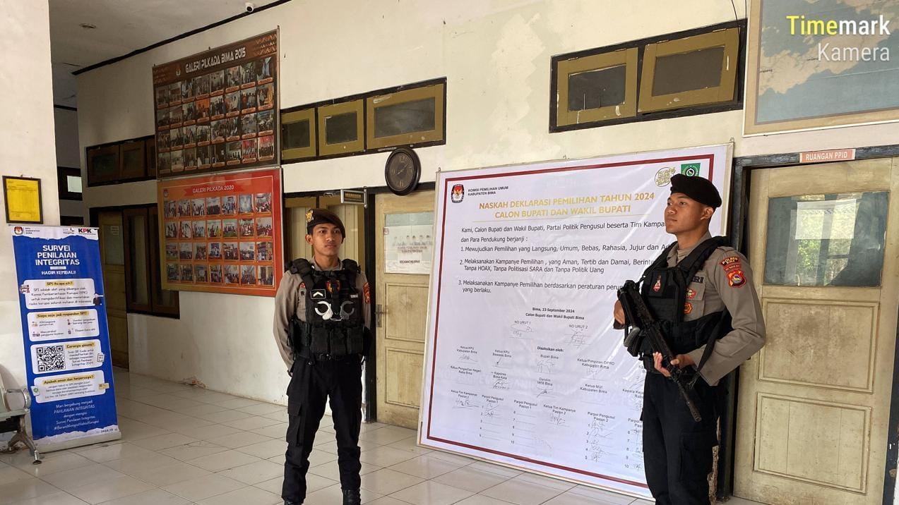 Dua personel dengan senjata lengkap itu melakukan pengamanan di kantor Komisi Pemilihan Umum Kabupaten Bima