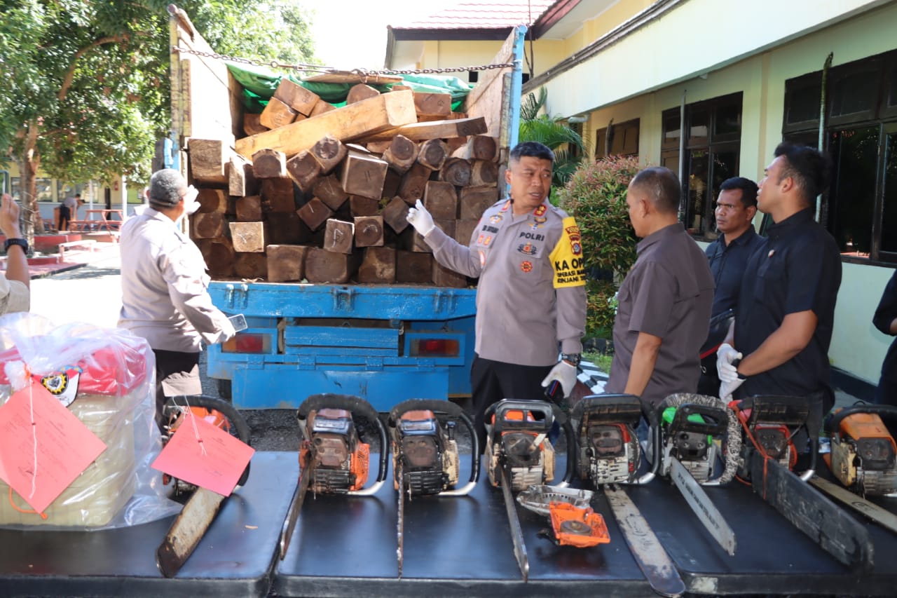 Dari hasil olah TKP itu, petugas berhasil mengamankan 8 batang kayu balok (volume 0,394 meter kubik) dan 1 lembar kayu papan jenis sonokeling, serta 8 unit mesin pemotong kayu atau Chainsaw dan sejumlah perkakas pendukung lainnya, serta mengamankan seorang terduga berinisial S.