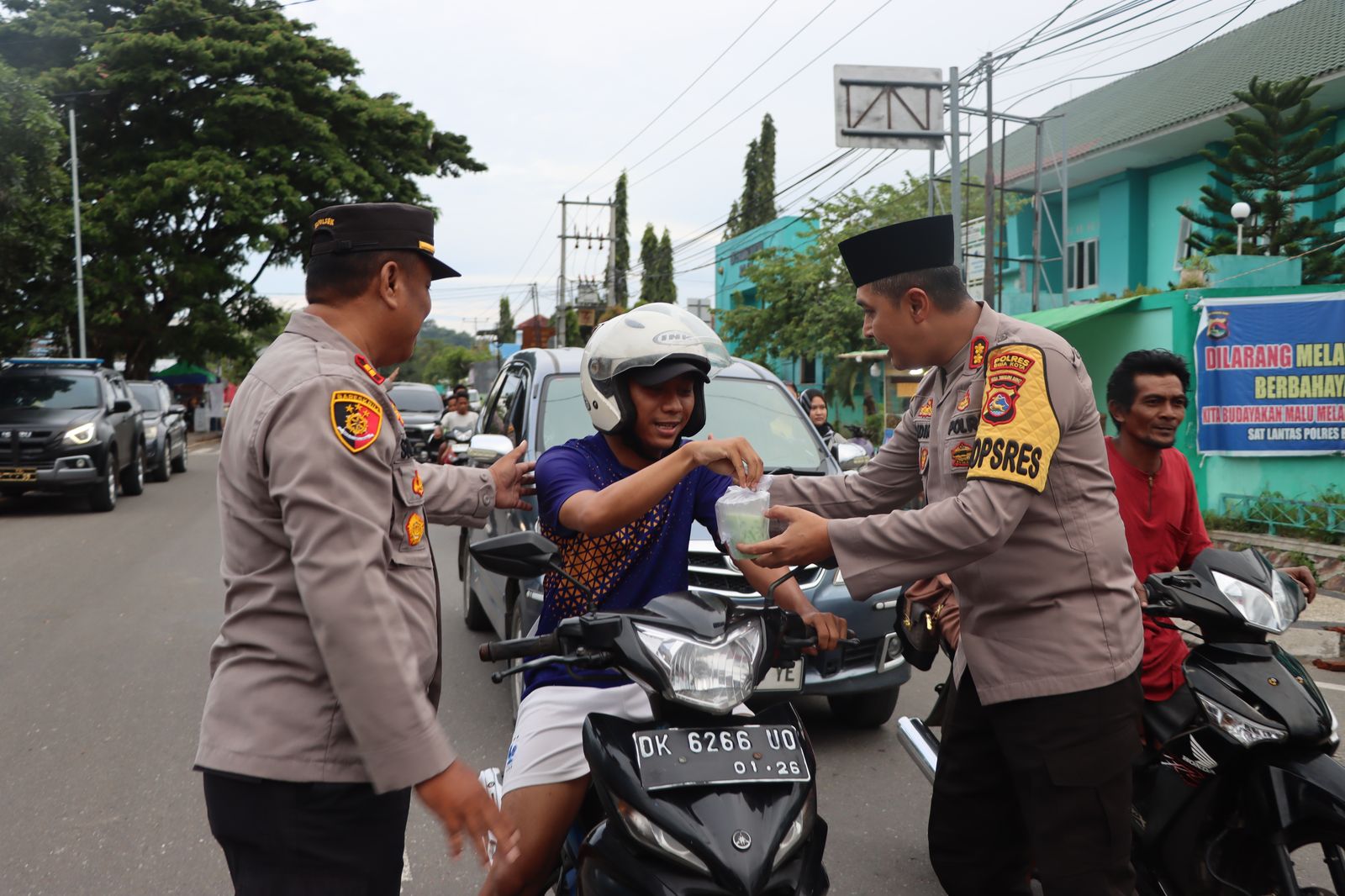 Kota Bima, NTB (10 Maret 2025) – Dalam semangat berbagi di bulan suci Ramadan, Polres Bima Kota menggelar kegiatan pembagian takjil bagi masyarakat di Jalan Gajah Mada, depan Kantor Pos Kota Bima. Kegiatan ini dipimpin langsung oleh Kapolres Bima Kota, AKBP Didik Putra Kuncoro, S.I.K., M.Si., dan turut dihadiri oleh Ketua Bhayangkari Cabang Bima Kota, Ibu Mira Didik.
