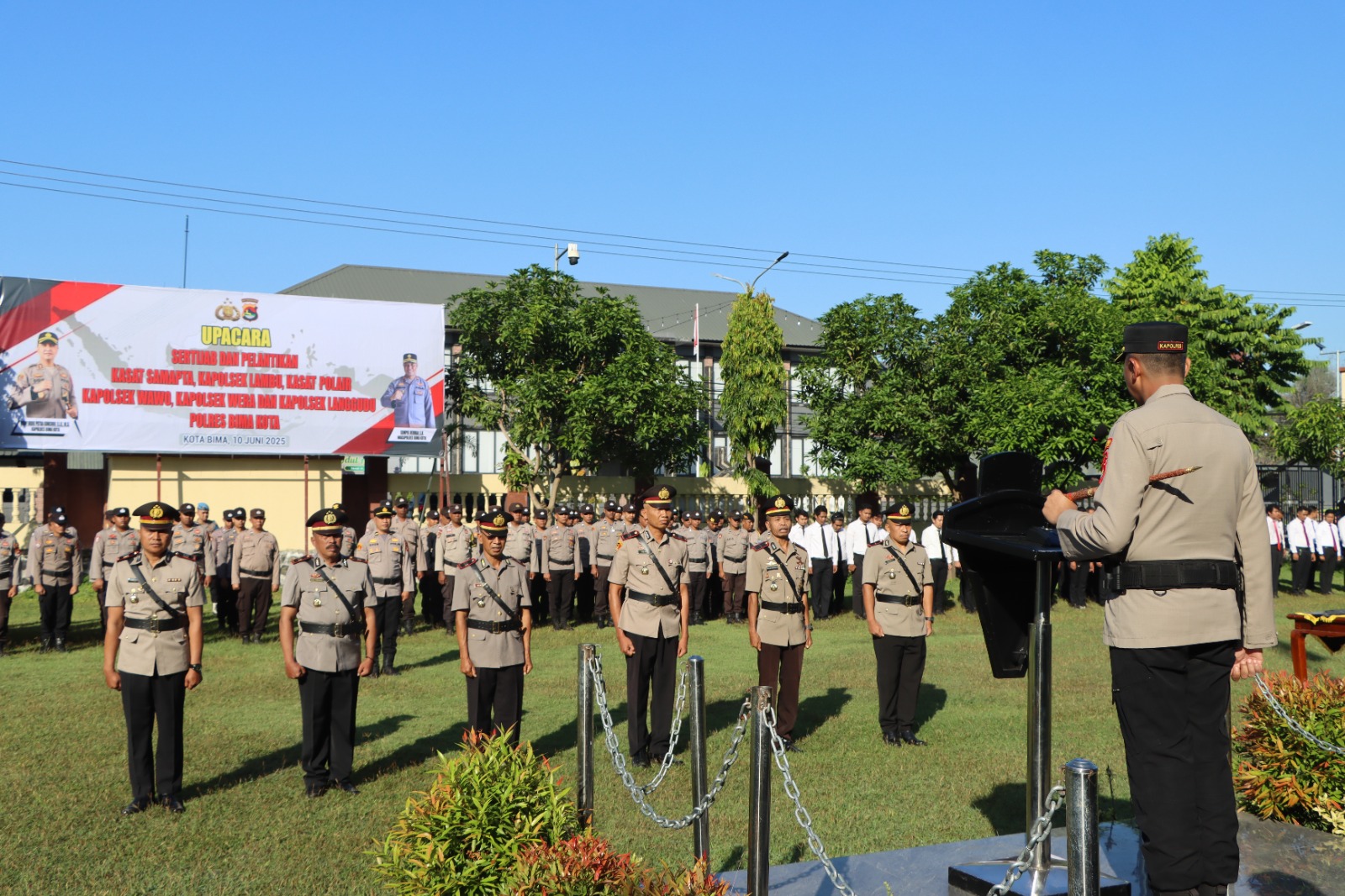 Upacara berlangsung dengan khidmat dan dihadiri oleh para pejabat utama Polres Bima Kota, perwira staf, personel Polres, serta Bhayangkari Cabang Bima Kota.