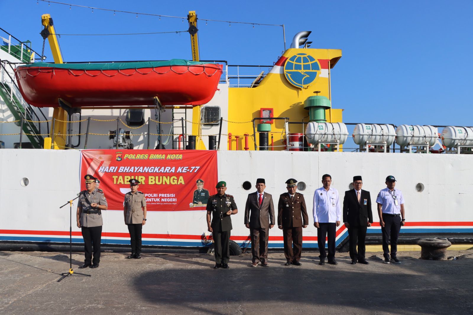 Upacara tabur bunga dalam rangka HUT Bhayangkara ke-77 tersebut, berlangsung Kamis (22/6)2023) di Pelabuhan Bima.