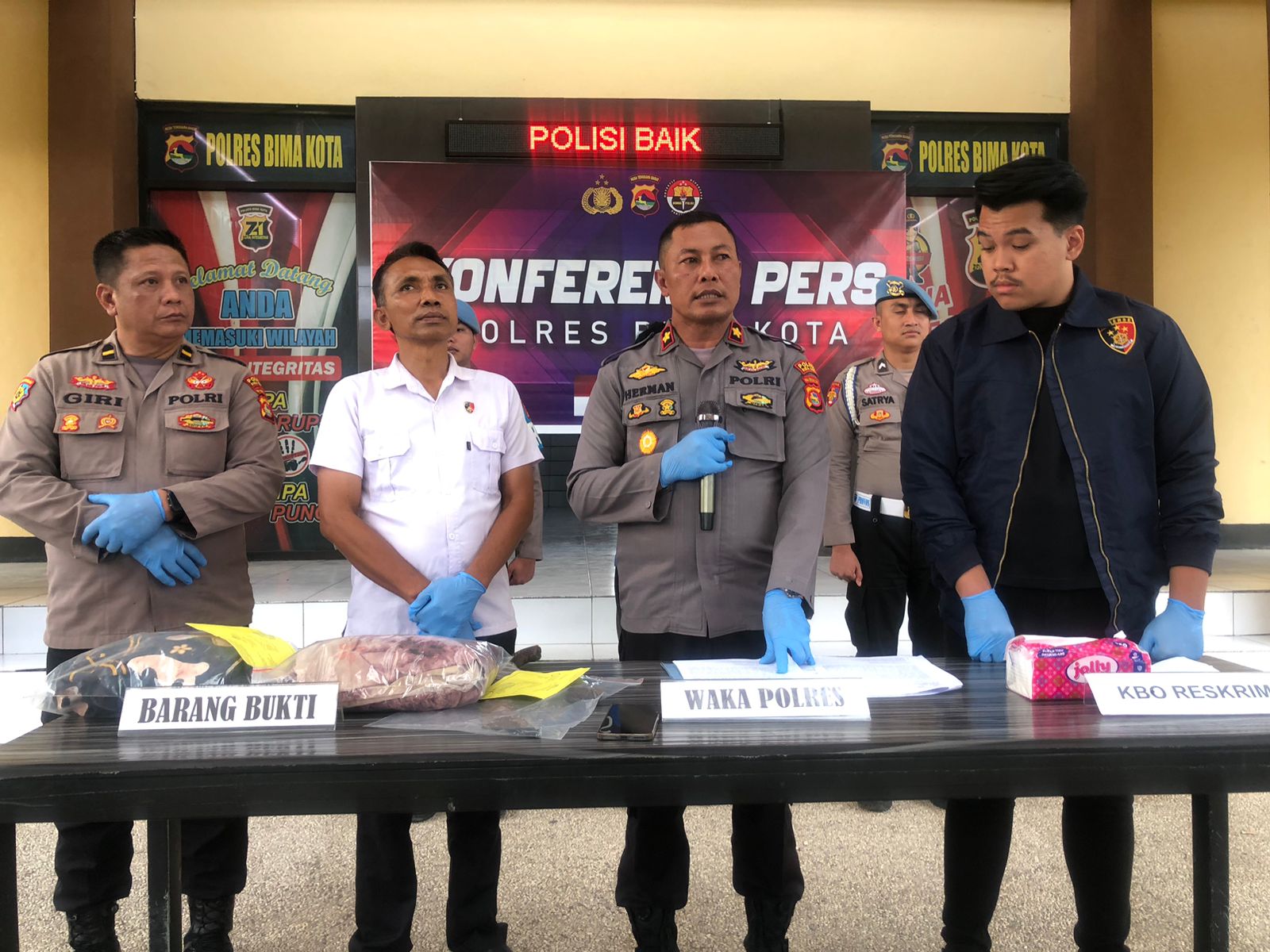 Informasi resmi ini disampaikan oleh Wakapolres Bima Kota Kompol Herman, S.H., saat menggelar konferensi pers pada Rabu sore (18/6) sekitar pukul 17.30 WITA di Mako Polres Bima Kota. Wakapolres didampingi oleh KBO Reskrim I Wayan Mariana, Kasiwas Iptu Putu Surwarjana Giri, Kanit Pidum Ipda Henry Jonathan Hutaurut, serta sejumlah pejabat utama Polres Bima Kota.