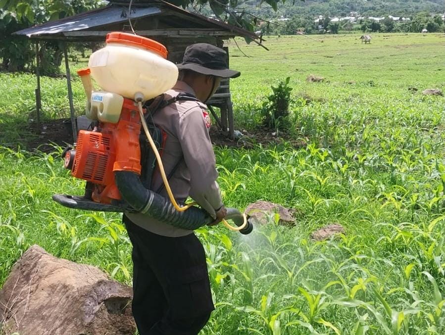 Seperti yang dilakukan oleh Bhabinkamtimas polsek Bolo Bripka Tarmiji melakukan penyeprotan gulma di lahan seluas 5000 meter persegi milik warga binaanya di Desa Tumpu Kecamatan Bolo Kabupaten Bima.