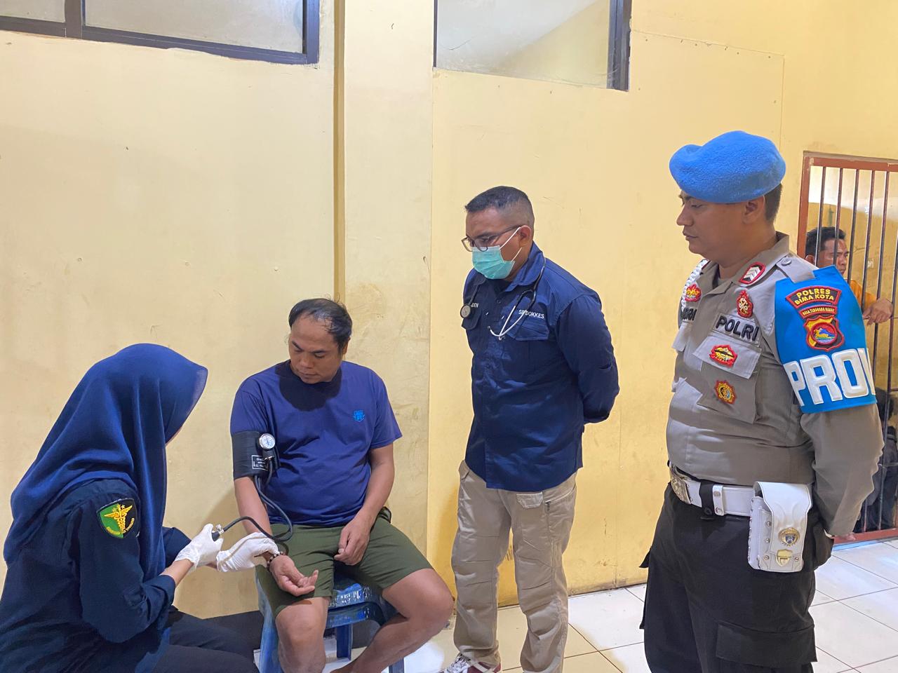 Dari hasil pemeriksaan terhadap 86 orang tahanan yang berada di Rutan Polres Bima Kota, secara umum dinyatakan sehat. Namun, ada dua orang tahanan yang mengalami keluhan kesehatan berupa nyeri pada badan, pusing, dan lemas. Kedua tahanan tersebut telah diberikan terapi obat oleh petugas dari Si Dokkes.