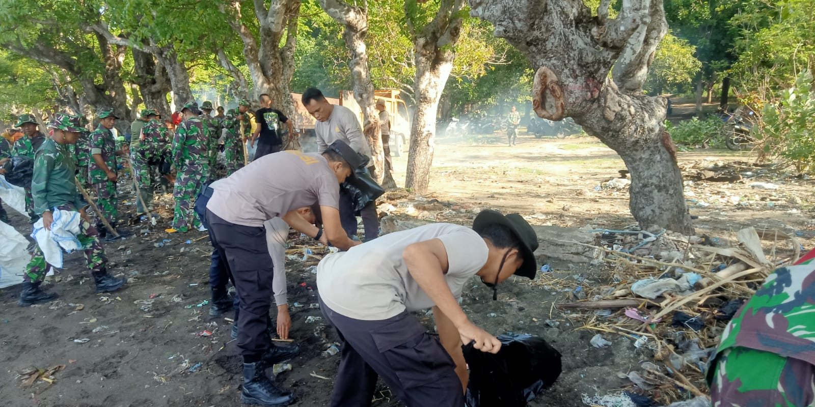 Kota Bima, NTB (22/12) – Dalam rangka memperingati Hari Juang TNI yang ke-78, aparat gabungan TNI, Polri, Dinas BPBD Kota Bima, camat, dan lurah se-Kecamatan Asakota Kota Bima melaksanakan kegiatan bersih-bersih pantai. Kegiatan ini bertujuan untuk memberikan kontribusi positif bagi lingkungan sekaligus merayakan semangat juang TNI yang telah berdedikasi untuk menjaga keamanan dan kedaulatan negara.