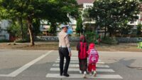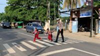 Personel Sat Lantas Polres Bima Kota Bantu Anak Sekolah Menyeberang Jalan