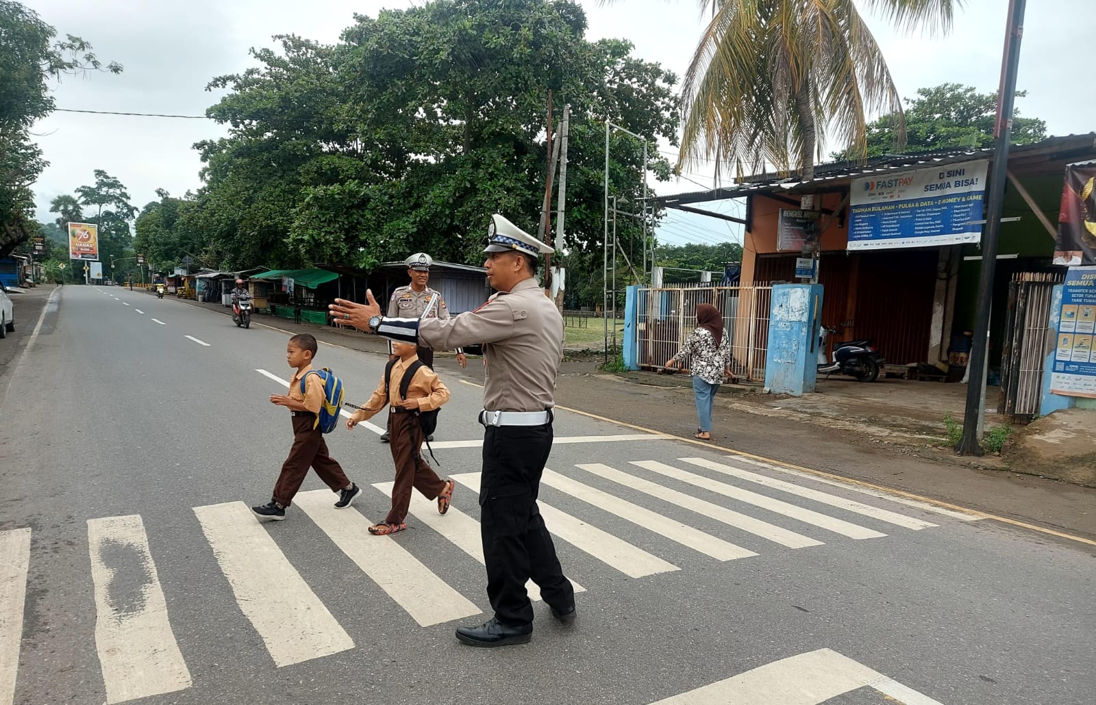 Sat lantas pagi ini terlibat aktif dalam memastikan kelancaran arus kendaraan di sejumlah titik rawan serta membantu siswa sekolah menyebrang jalan.