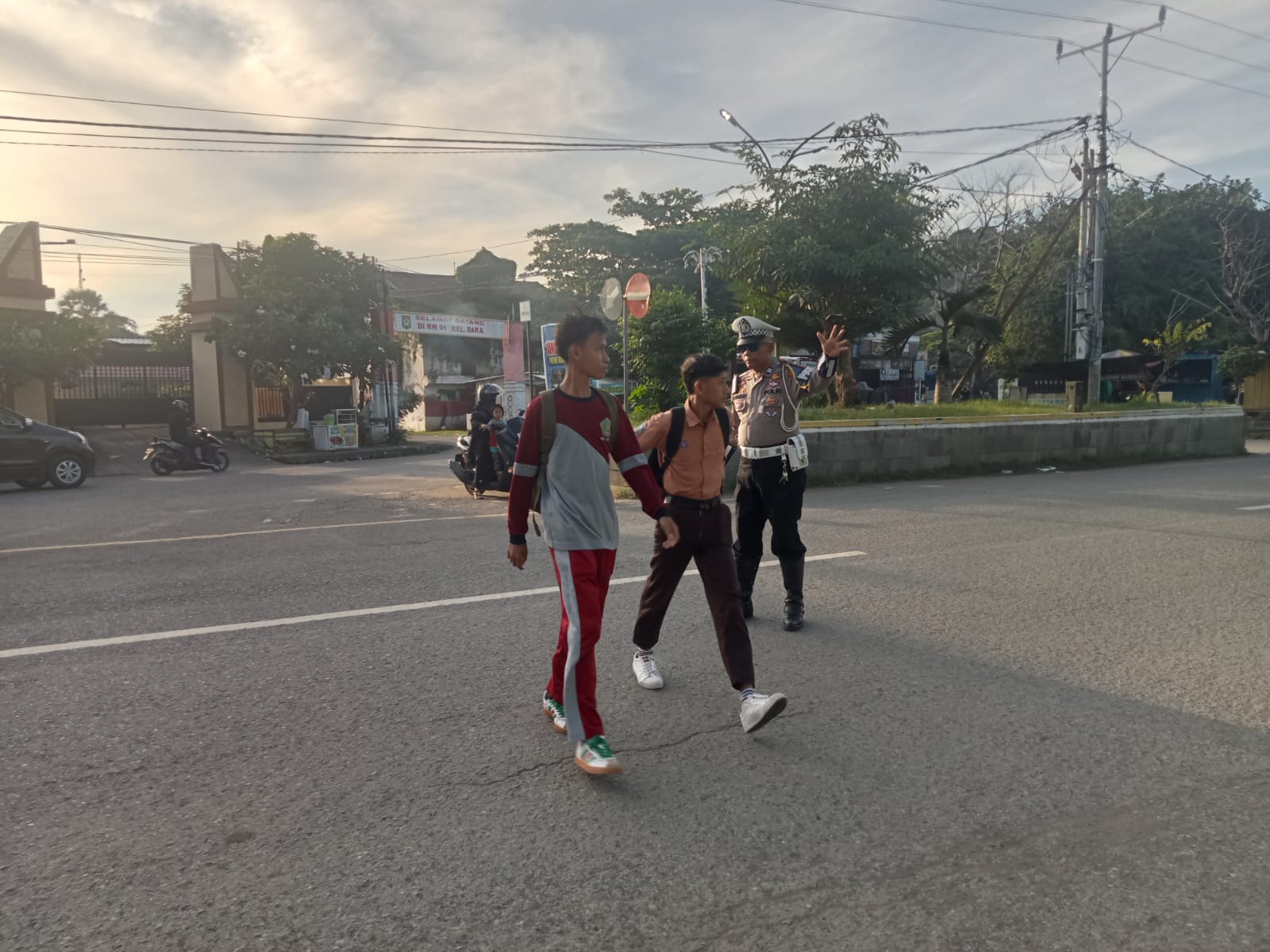 Selain mengatur arus lalu lintas agar tetap lancar, petugas juga membantu menyebrangkan pelajar dan memastikan tidak terjadi kemacetan ataupun potensi kecelakaan lalu lintas di sekitar area sekolah.