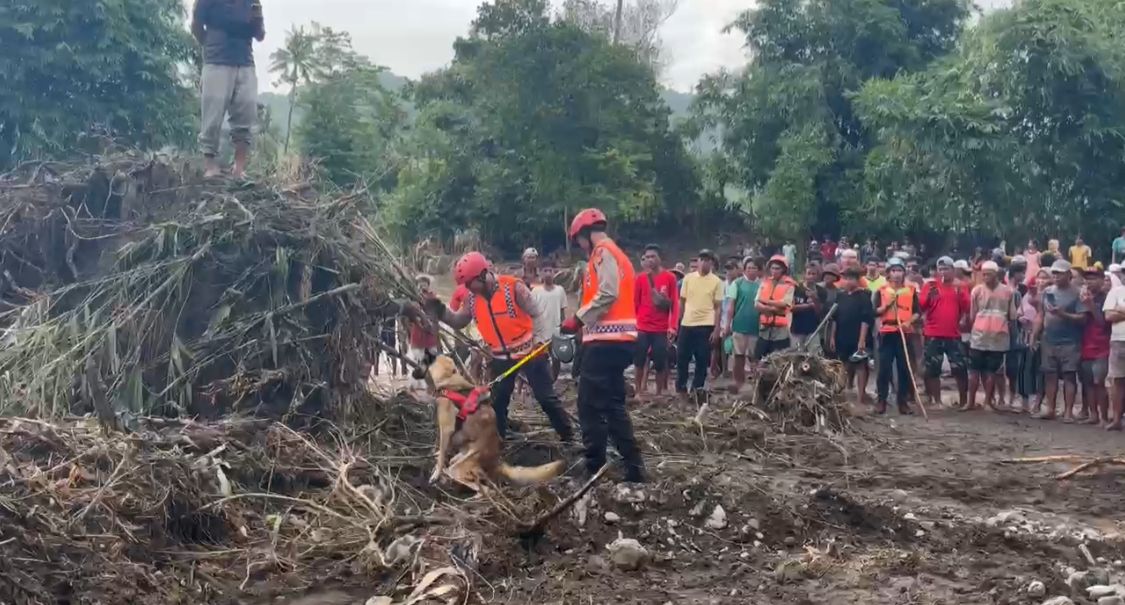 Kota Bima, NTB (6 Februari 2025) – Upaya pencarian terhadap lima korban banjir bandang di Kecamatan Wera, Kabupaten Bima, hingga saat ini masih terus dilakukan. Untuk mempercepat proses pencarian, Kepolisian Daerah Nusa Tenggara Barat (Polda NTB) mengerahkan personel bersama satu ekor anjing pelacak dari Unit Polmas K-9 Direktorat Samapta yang memiliki keahlian dalam pencarian dan penyelamatan (SAR).