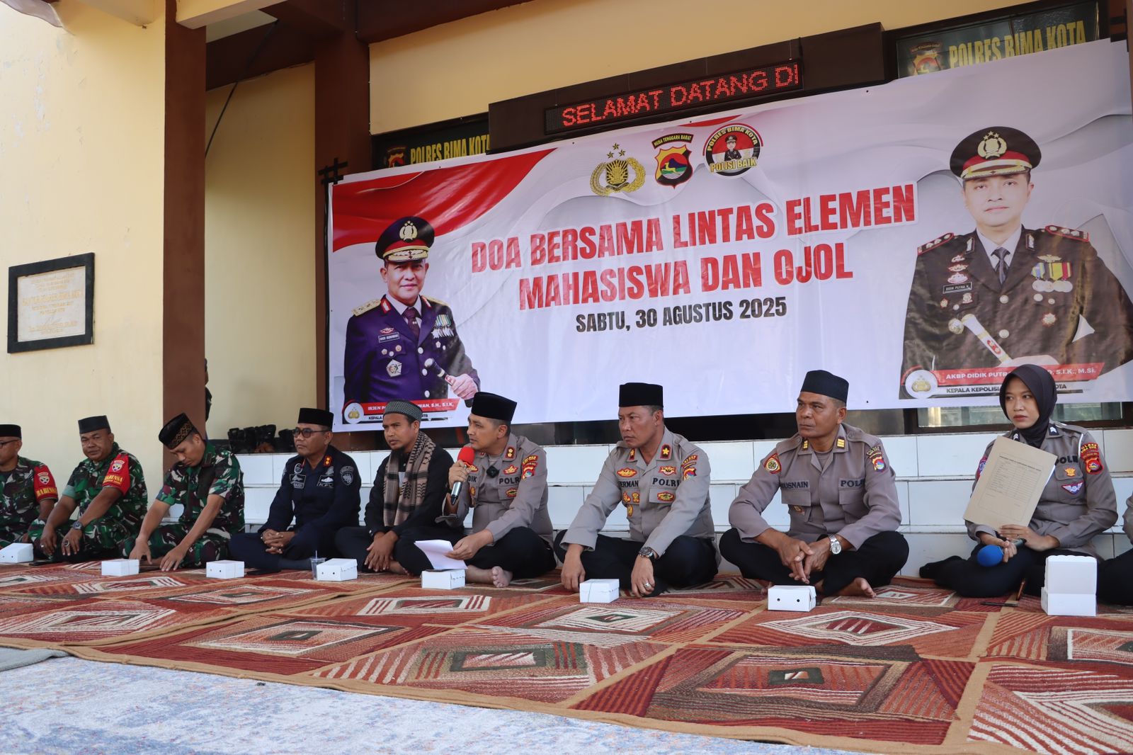 Kapolres Bima Kota, AKBP Didik Putra Kuncoro, S.I.K., M.Si., dalam sambutannya menyampaikan bahwa doa bersama ini menjadi wujud nyata pengabdian Polri bersama seluruh elemen masyarakat dalam menjaga situasi kamtibmas yang kondusif. Menurutnya, keterlibatan mahasiswa dan komunitas Ojol menunjukkan bahwa semangat menjaga keamanan bukan hanya tugas aparat, tetapi tanggung jawab bersama.