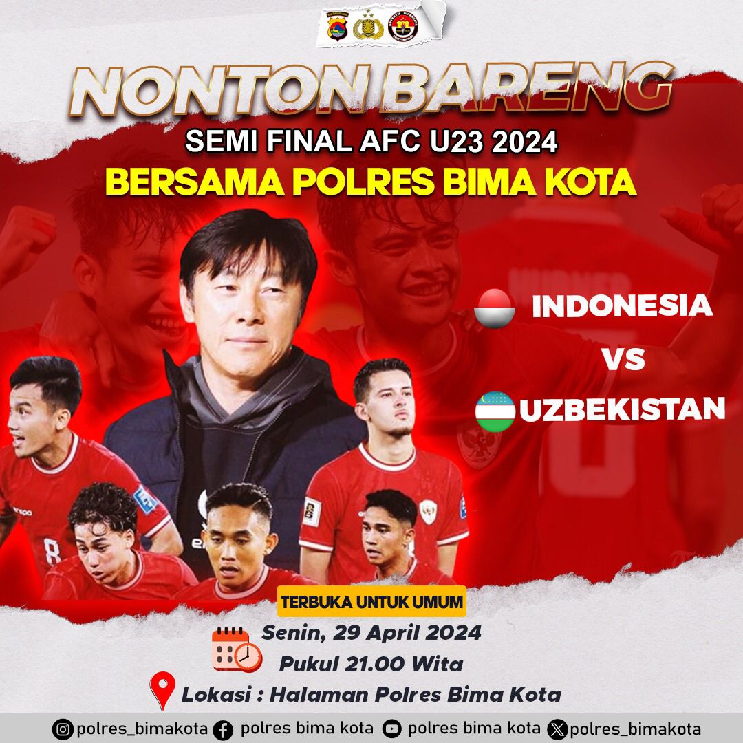Kota Bima, NTB (29/4) – Gairah sepakbola Indonesia semakin memuncak dengan masuknya Timnas Indonesia U-23 ke babak semifinal Piala AFC Asian U-23 2024. Polres Bima Kota, Polda NTB, ikut merasakan semangat tersebut dengan menggelar acara Nonton Bareng (Nobar) di halaman Mako Polres Bima Kota pada Senin, (29/04/2024) mulai pukul 21.00 WITA.