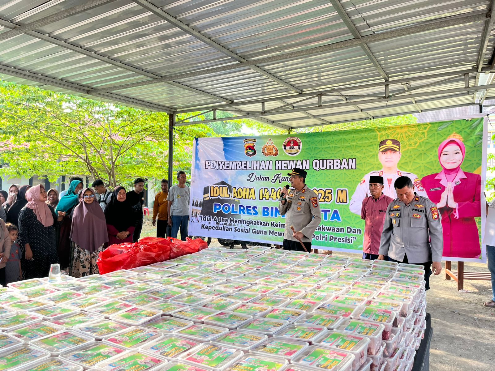 Kota Bima, NTB (6 Juni 2025) – Dalam rangka memperingati Hari Raya Idul Adha 1446 Hijriah, Polres Bima Kota melaksanakan kegiatan qurban dengan menyembelih 15 ekor sapi dan 2 ekor kambing. Dari hewan qurban tersebut, sebanyak 1.620 paket daging berhasil dikemas dan didistribusikan kepada masyarakat.