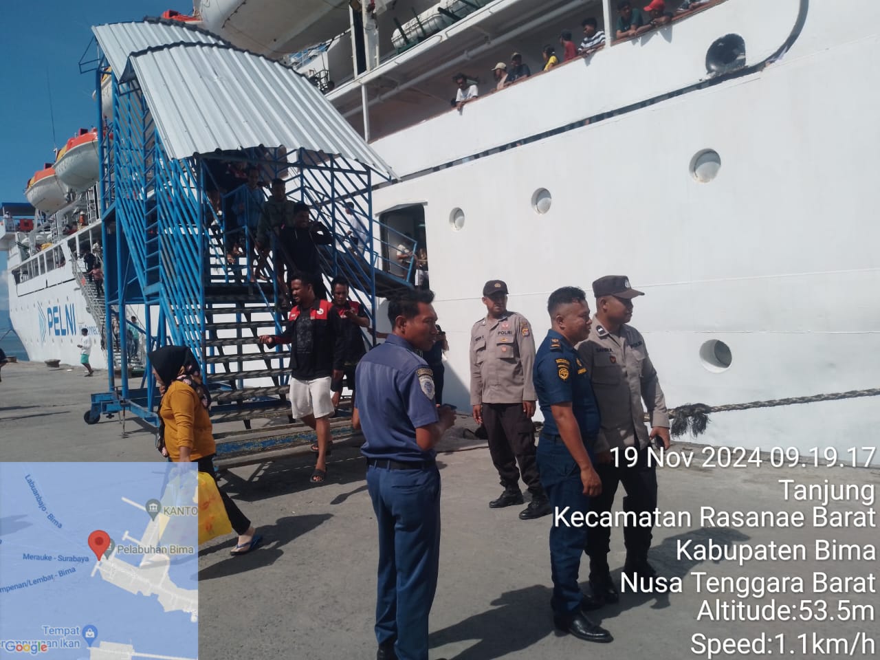 Kota Bima, NTB (19 November 2024) – Polsek Kawasan Pelabuhan Laut Bima melaksanakan pengamanan proses embarkasi dan debarkasi penumpang kapal KM. AWU yang bersandar di Pelabuhan Bima pada Selasa pagi. Pengamanan berlangsung mulai pukul 09.00 WITA di areal Pelabuhan Bima, Jalan R.E. Marthadinata, Kelurahan Tanjung, Kecamatan Rasanae Barat, Kota Bima.