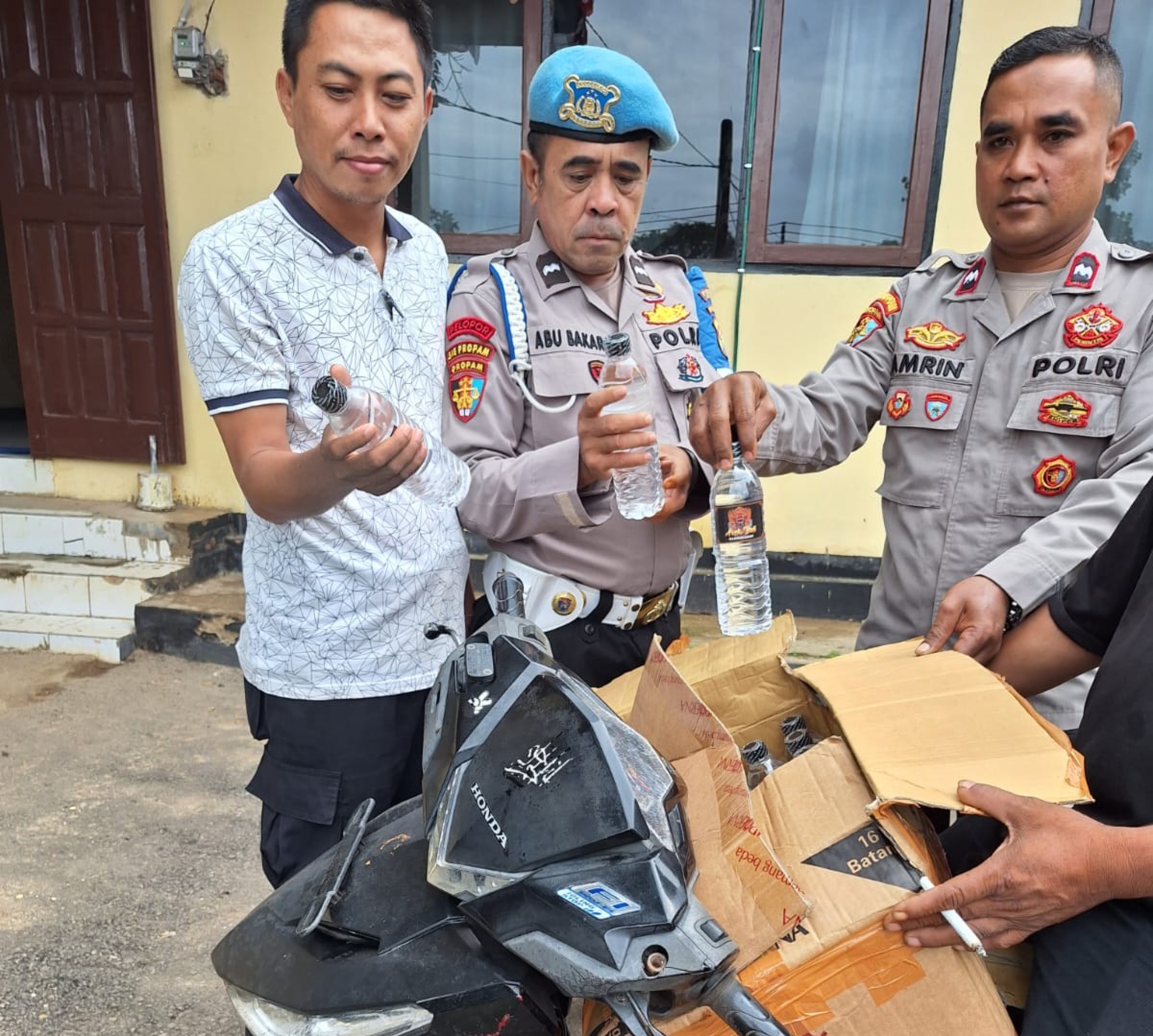 Pengendara yang diamankan berinisial MA (30), seorang wiraswasta asal Desa Karumbu, Kecamatan Langgudu, Kabupaten Bima. Saat diperiksa, MA tidak dapat menunjukkan izin edar atas minuman keras yang dibawanya.