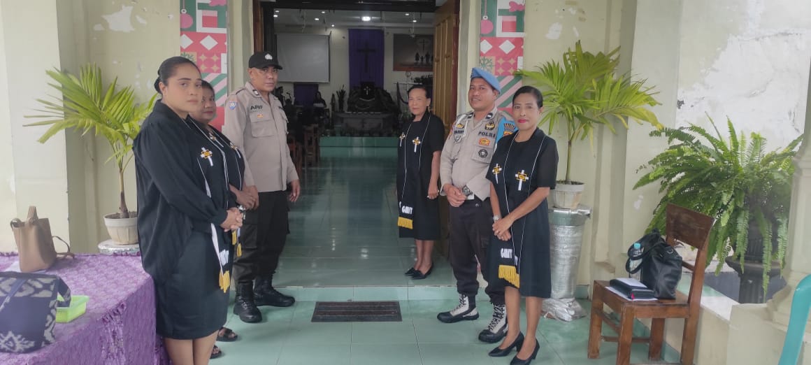 Kota Bima, NTB (18 April 2025) – Dalam rangka memberikan rasa aman dan nyaman kepada umat Kristiani yang melaksanakan ibadah Jumat Agung Paskah, personel gabungan dari Polsek Rasanae Timur bersama Polsubsektor Raba, anggota Lantas, serta anggota Intel Polres Bima Kota melaksanakan pengamanan di Gereja GMIT Bethel Raba Bima, Jumat (18/4/2025) pagi.