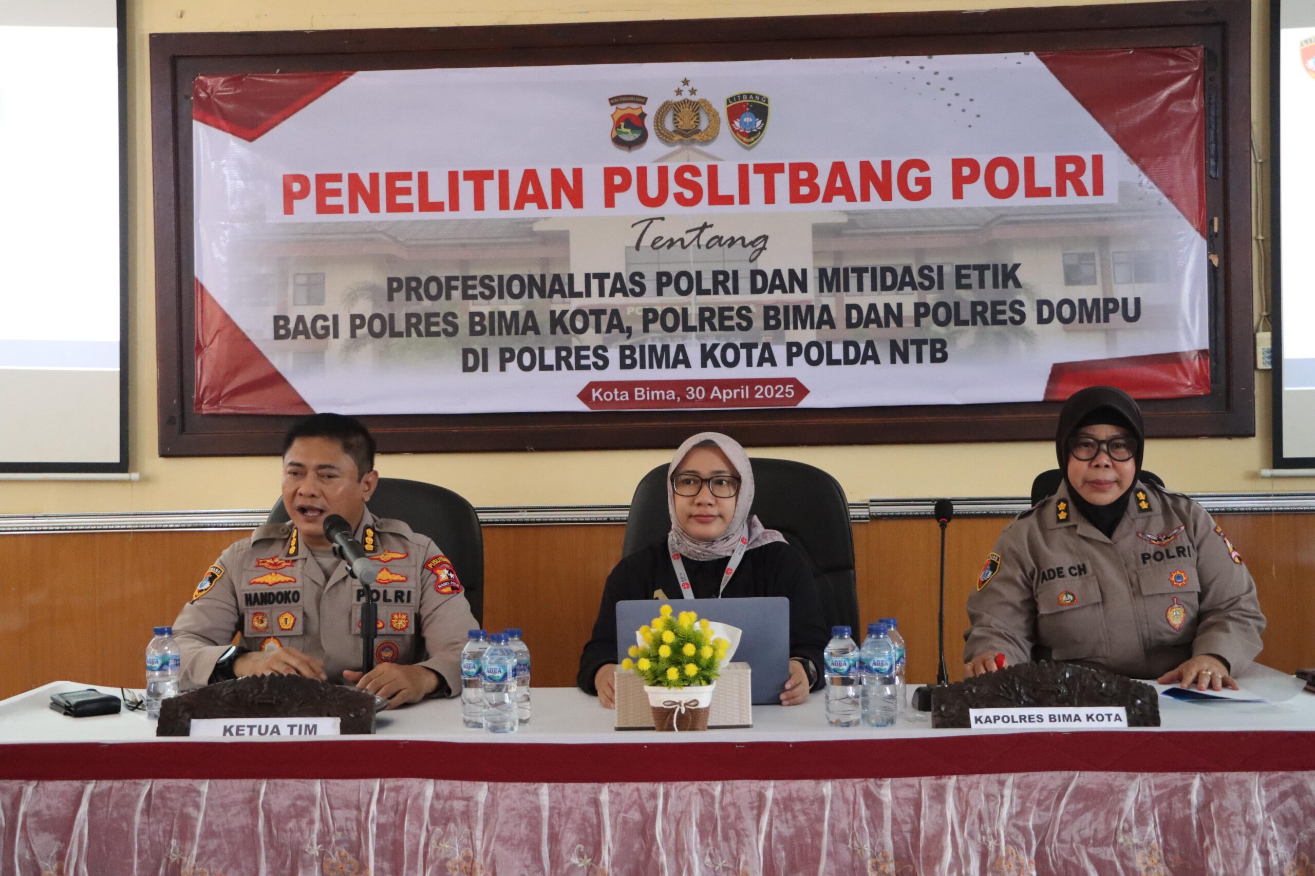Kota Bima, NTB (30 April 2025) – Pusat Penelitian dan Pengembangan (Puslitbang) Polri menggelar kegiatan penelitian bertajuk “Profesionalitas dan Mitigasi Etik” yang melibatkan tiga Polres di wilayah Polda NTB, yakni Polres Bima Kota, Polres Bima, dan Polres Dompu. Kegiatan ini berlangsung pada Rabu (30/4/2025) pukul 13.00 WITA di Ruang Rapat Rupatama Polres Bima Kota.