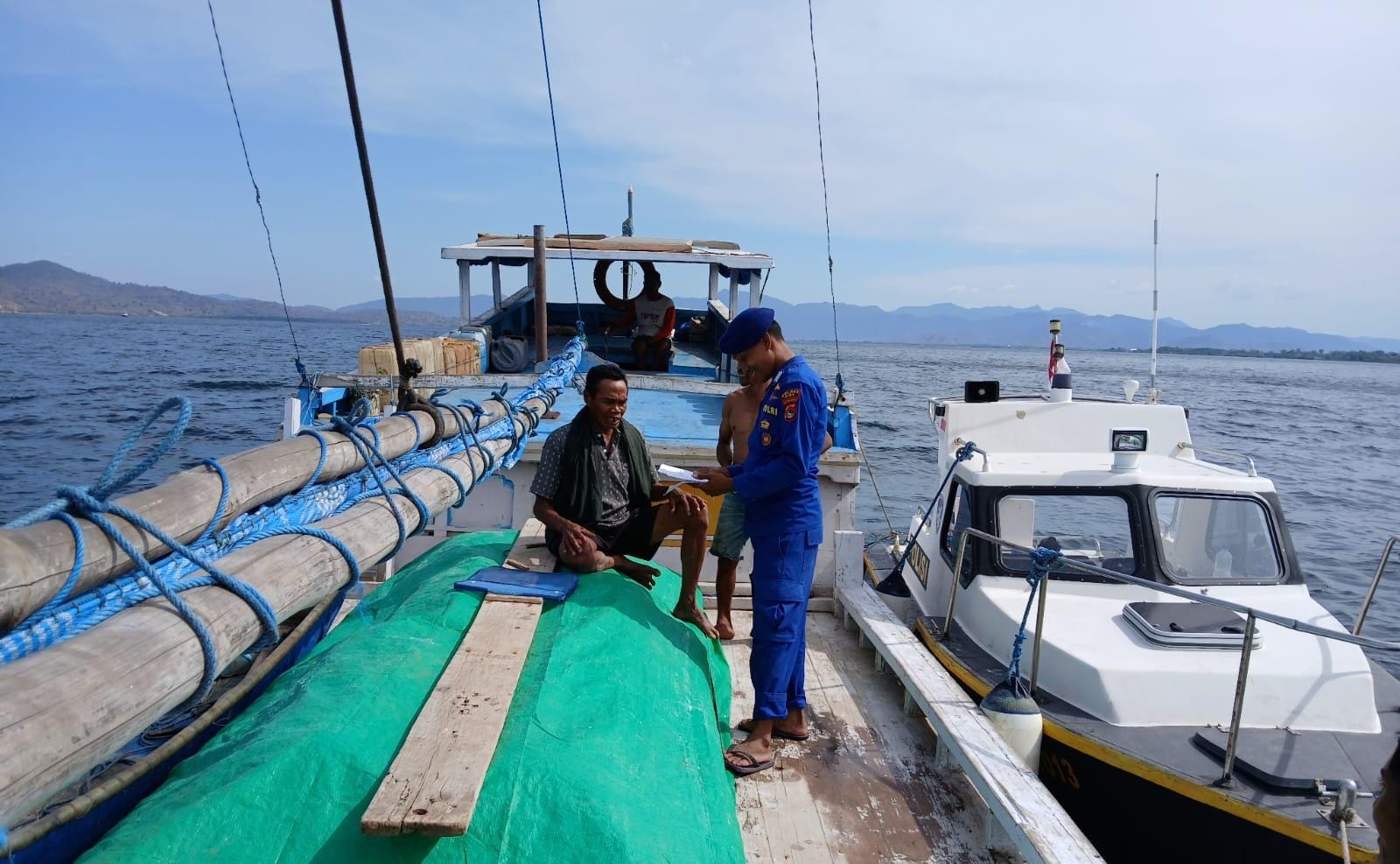 Tim patroli juga melakukan pemeriksaan kelengkapan surat-surat dan barang muatan terhadap kapal pengangkut barang yang melintas di perairan teluk Bima.