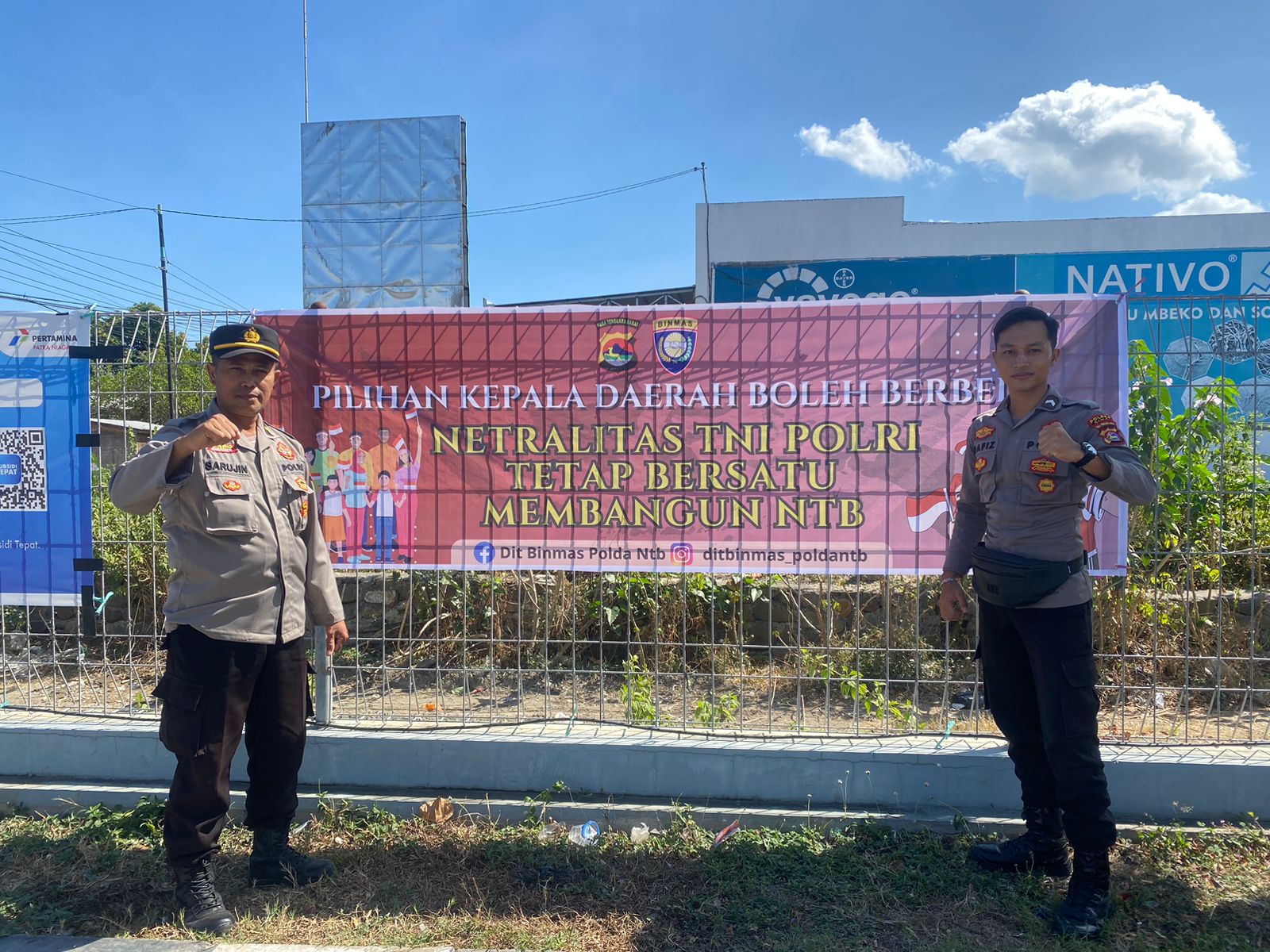 Spanduk yang bertuliskan” Pilihan Kepala Daerah Boleh Berbeda, Netralitas TNI-POLRI Tetap Bersatu Membangun NTB”.