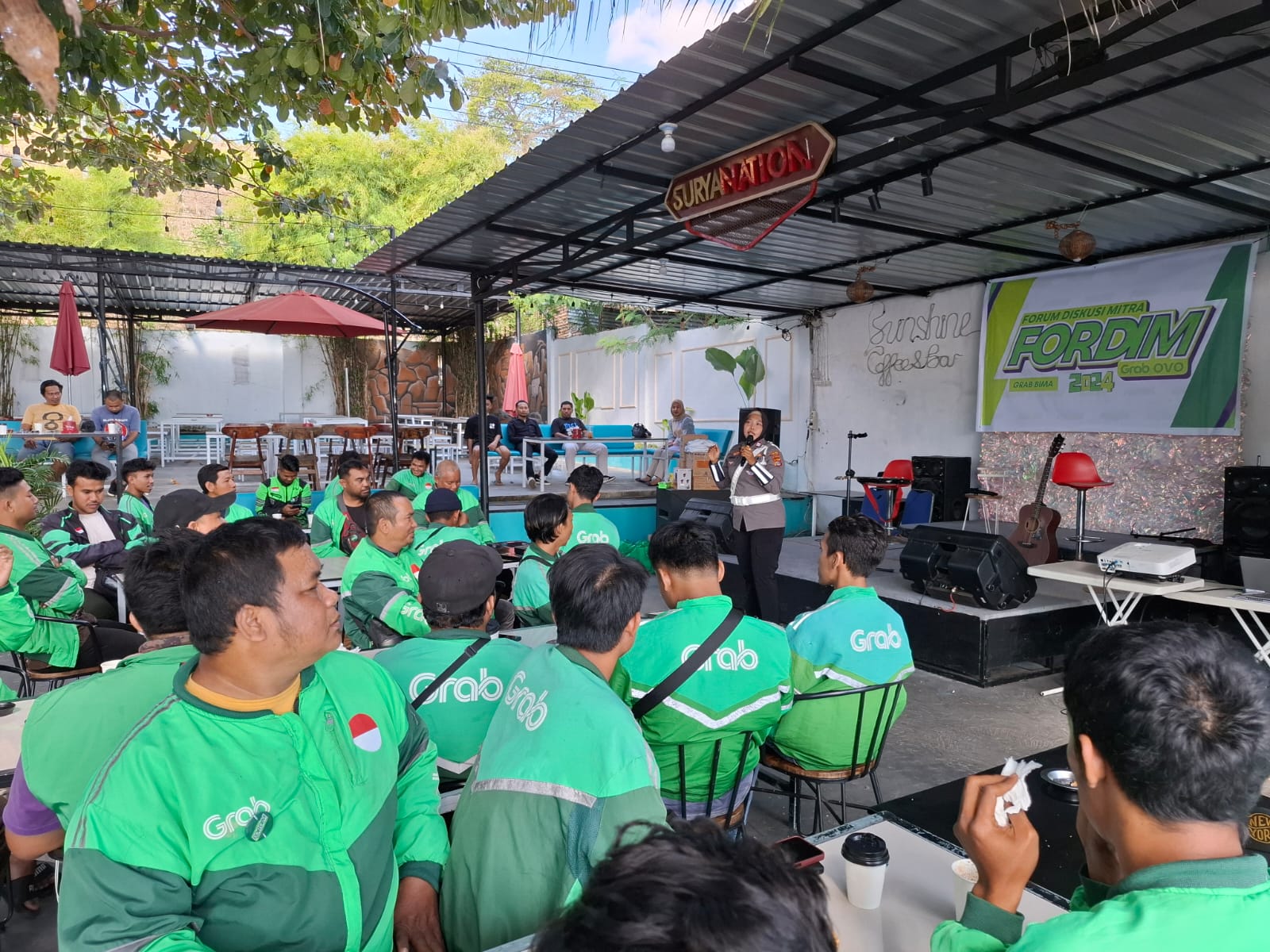 Kota Bima, NTB (22/07) – Sat Lantas Polres Bima Kota menggelar sosialisasi keselamatan lalu lintas bersama komunitas Grab Kota Bima. Acara ini berlangsung di Cafe Sunshine, Ule, Kecamatan Asakota, Kota Bima, pada Sabtu siang pukul 13.00 Wita.