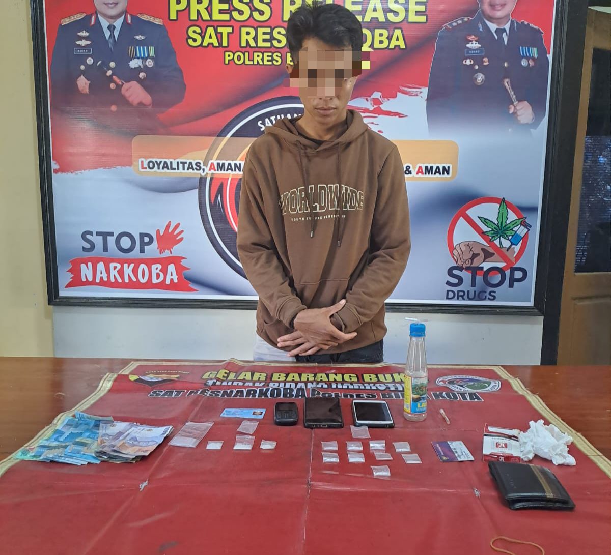 Adapun barang bukti yang berhasil diamankan saat penggeledahan dengan disaksikan tokoh masyarakat setempat, sambung Kasat Narkoba menjelaskan, 12 klip sabu dengan berat bersih 2,53 gram, 2 klip kosong, dua buah handphone, dompet, botol kaca, bong atau alat isap, rokok dan uang sejumlah 500 ribu rupiah.