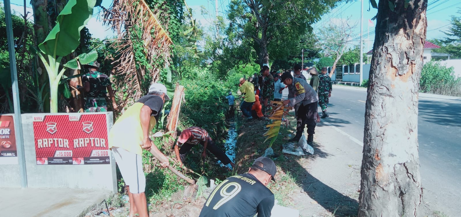 Dalam kegiatan tersebut terlihat kebersamaan antara TNI, polri, Masyarakat dan pemerintah setempat memotong rumput dan membersihkan selokan sepanjang jalan di Desa Penapali.