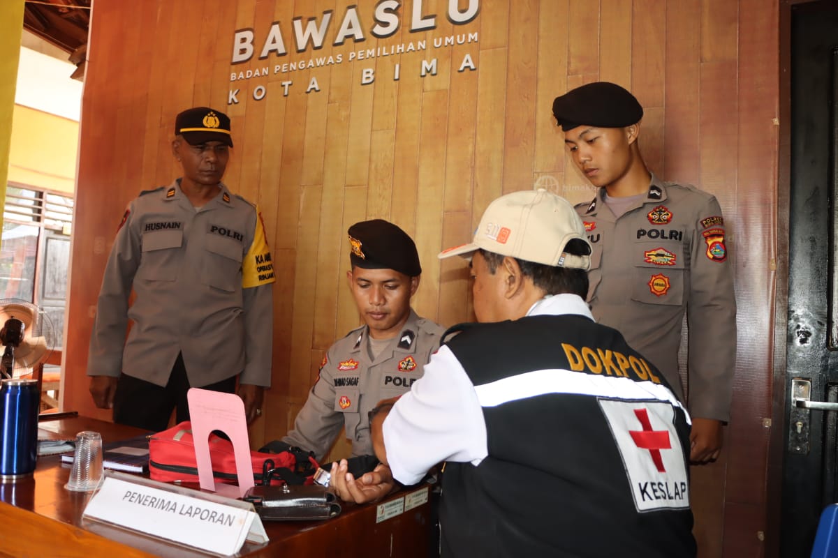 Kota Bima, NTB (6/12) – Subsatgas Dokes OMB Rinjani 2024 Dokkes Polres Bima Kota melaksanakan pengecekan kesehatan personel yang sedang bertugas dalam penjagaan di sekitar Kantor Komisi Pemilihan Umum (KPU) Kota Bima, Gudang Logistik KPU Kota Bima, dan Badan Pengawas Pemilu (Bawaslu). Kegiatan ini dilakukan untuk memastikan kesehatan, keamanan, dan kelancaran setiap tahapan Pemilihan Umum (Pemilu) 2024.