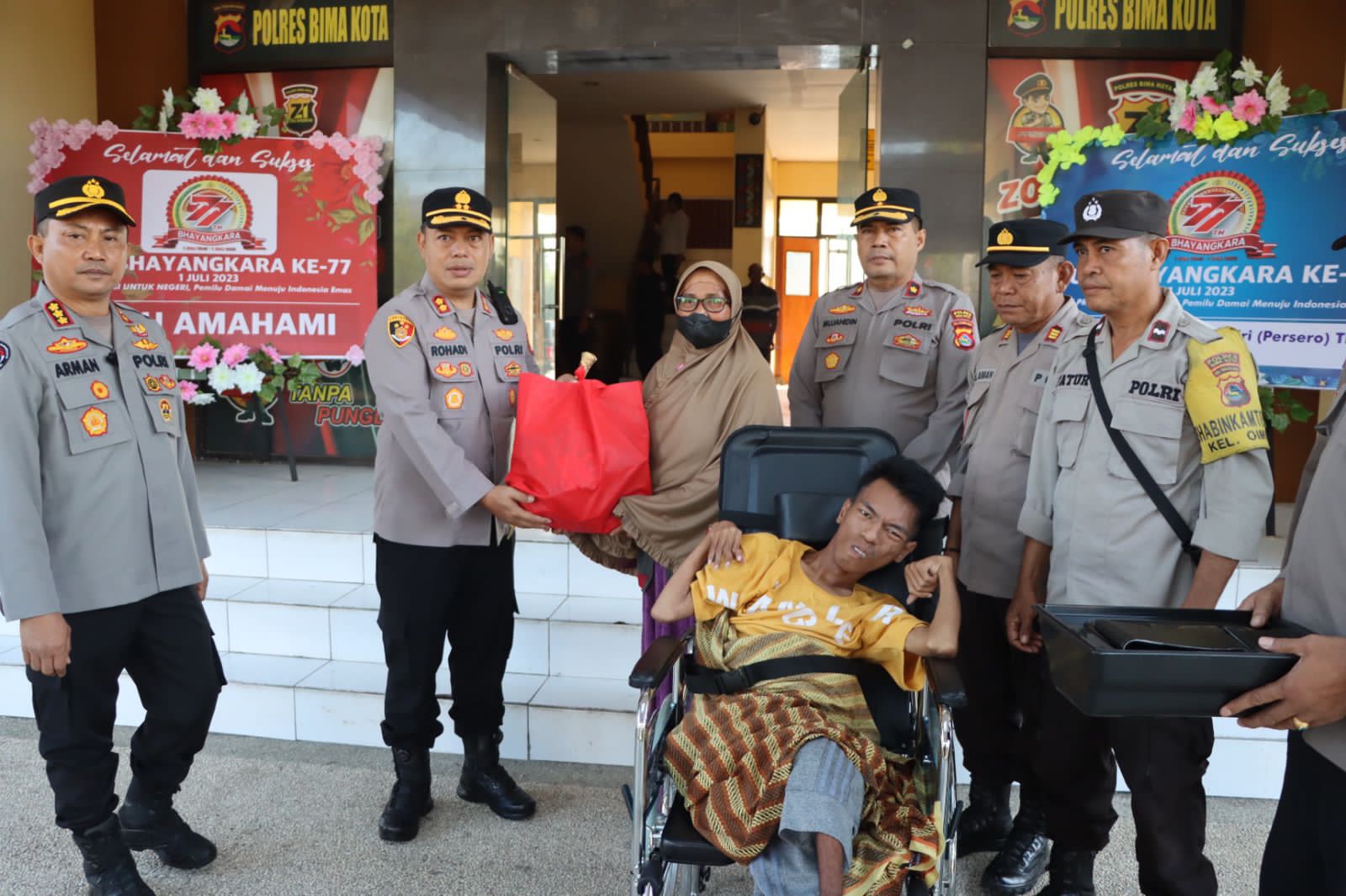 Kota Bima, NTB (23/6) – Wujud peduli dan empati pada sesama, terutama warga penyandang Disabilitas, Polres Bima Kota berbagi kursi roda dan nutrisi.