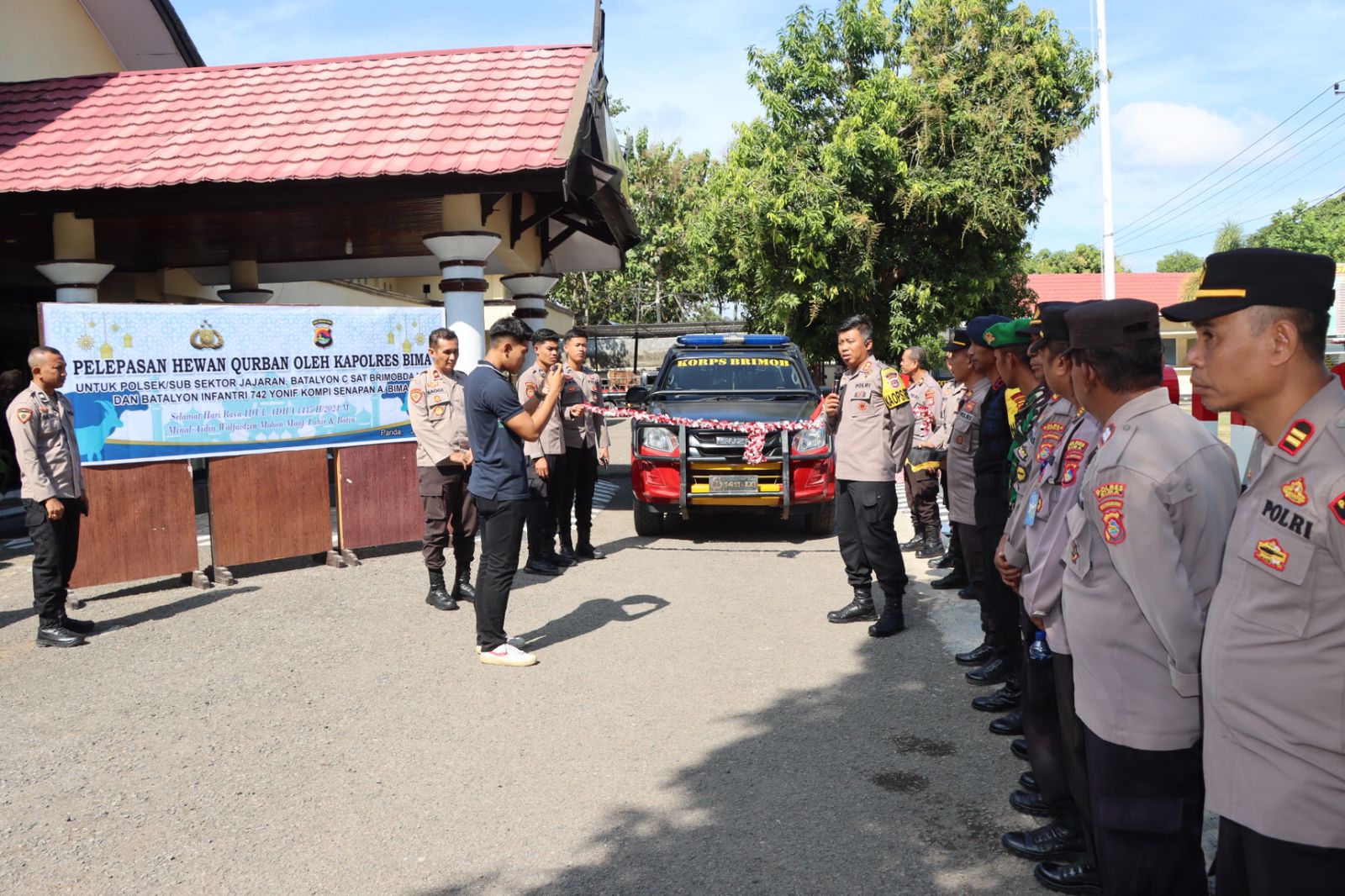 “Alhamdulillah di hari raya Idul Adha 1445 H tahun 2024 M ini Kita distribusikan Sapi Qurban untuk masyarakat melalui Polsek Jajaran, Batalyon C Brimob Pelopor Bima dan Batalyon 742 SWY Kompi Senapan A”. Kata Kapolres sebagaimana diulas kasi Humas Iptu Adib Widayaka.